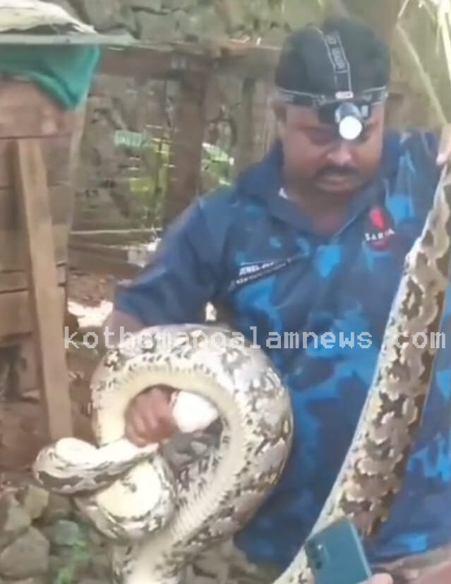 പടം :കോട്ടപ്പടി ചേറങ്ങനാൽ കവലക്ക് സമീപമുള്ള വീട്ടിലെ കോഴിക്കൂട്ടിൽ നിന്നും മലമ്പാമ്പിനെ കോട്ടപ്പടി സ്വദേശി ജൂവൽ ജൂഡിയാണ് പിടികൂടുന്നു.