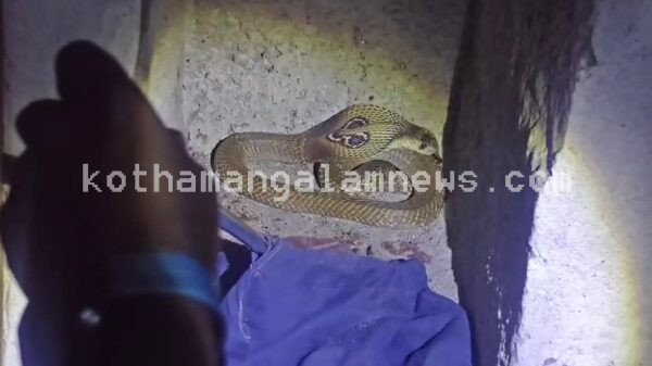 കോതമംഗലം: കോതമംഗലത്ത് വീടിൻ്റെ അടുക്കളയുടെ വർക്ക് ഏരിയയിൽ സ്ലാബുകൾക്കിടയിൽ ഒളിച്ച മൂർഖൻ പാമ്പിനെ പിടികൂടി. വെണ്ടുവഴി, ചാലിങ്കൽ നഗർ മൂഴിയിൽ മണിയുടെ വീടിൻ്റെ അടുക്കള ഭാഗത്ത് സന്ധ്യയോടെയാണ് പാമ്പിനെ കണ്ടത്. പാമ്പുപിടുത്ത വിദഗ്ദ്ധൻ...