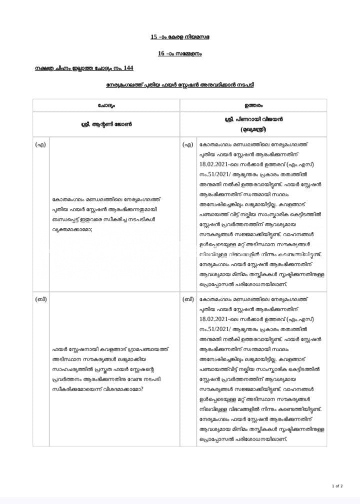 കോതമംഗലം മണ്ഡലത്തിലെ നേര്യമംഗലത്ത് പുതിയ ഫയർ സ്റ്റേഷൻ ആരംഭിക്കുന്നതിന് 18.02.2021-ലെ സർക്കാർ ഉത്തരവ് (എം.എസ്) നം.51/2021/ ആഭ്യന്തരം പ്രകാരം തത്വത്തിൽ അനുമതി നൽകി ഉത്തരവായിട്ടുണ്ട്. ഫയർ സ്റ്റേഷൻ ആരംഭിക്കുന്നതിന് സ്വന്തമായി സ്ഥലം അന്വേഷിച്ചെങ്കിലും ലഭ്യമായിട്ടില്ല. കവളങ്ങാട് പഞ്ചായത്ത് വിട്ട് നല്കിയ സാംസ്കാരിക കെട്ടിടത്തിൽ സ്റ്റേഷൻ പ്രവർത്തനത്തിന് ആവശ്യമായ സൗകര്യങ്ങൾ സജ്ജമാക്കിയിട്ടുണ്ട്. വാഹനങ്ങൾ ഉൾപ്പെടെയുള്ള മറ്റ് അടിസ്ഥാന സൗകര്യങ്ങൾ നിലവിലുള്ള വിഭവങ്ങളിൽ നിന്നും കണ്ടെത്തിയിട്ടുണ്ട്. നേര്യമംഗലം ഫയർ സ്റ്റേഷൻ ആരംഭിക്കുന്നതിന് ആവശ്യമായ മിനിമം തസ്തികകൾ സൃഷ്ടിക്കുന്നതിനുള്ള പ്രൊപ്പോസൽ പരിശോധനയിലാണെന്നും മുഖ്യമന്ത്രി എംഎൽഎയുടെ ചോദ്യത്തിന് മറുപടിയായി നിയമസഭയിൽ അറിയിച്ചു