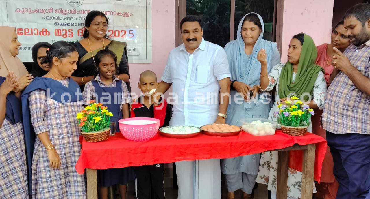 പല്ലാരിമംഗലം: ഗ്രാമപഞ്ചായത്ത് കുടുംബശ്രീ സിഡിഎസ്സിൻ്റെ നേതൃത്വത്തിൽ നടത്തിയ ലോക മുട്ടദിനാചരണം പഞ്ചായത്ത് ബഡ്സ് സ്കൂളിലെ കുട്ടികൾക്ക് മുട്ടവിതരണം നടത്തിക്കൊണ്ട് പഞ്ചായത്ത് വൈസ്പ്രസിഡൻ്റ് ഒ ഇ അബ്ബാസ് ഉദ്ഘാടനം ചെയ്തു സിഡിഎസ് ചെയർപേഴ്സൺ ഷെരീഫ റഷീദ് അദ്ധ്യക്ഷതവഹിച്ചു പഞ്ചായത്ത് അസിസ്റ്റൻ്റ് സെക്രട്ടറി എം എം നിസീമ, ബഡ്സ് സ്കൂൾ പ്രിൻസിപ്പൽ ശ്രീകല റെജി, സിഡിഎസ് മെമ്പർ ശ്രീജ അനിൽകുമാർ അക്കൗണ്ടൻ്റ് ജിജി ബിനോയ്, തസ്ലി അഷറഫ്, കെ എം ഹാജറ, കെ എം റഷീദ എന്നിവർ പ്രസംഗിച്ചു.